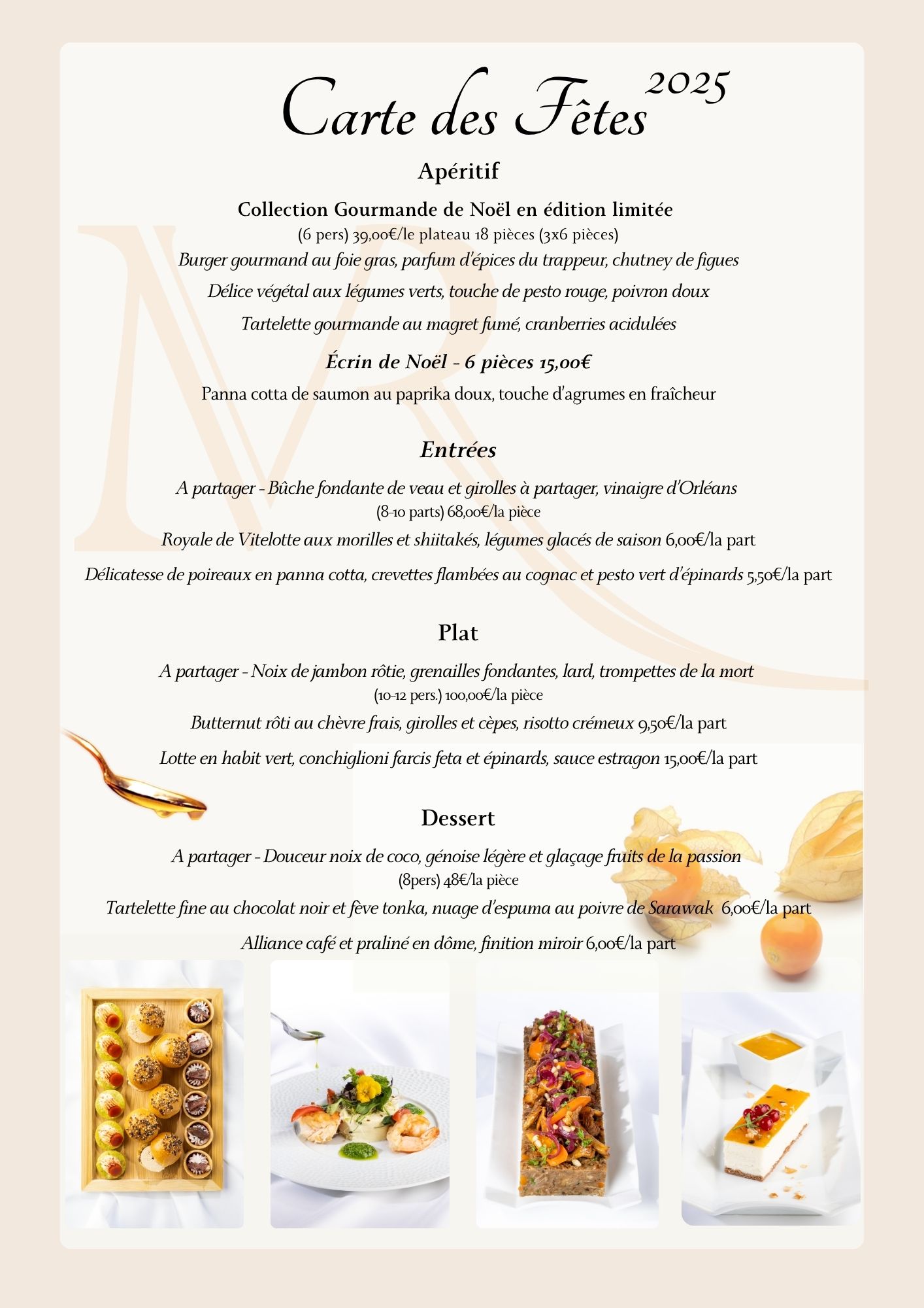 *Pour votre repas de la Saint Sylvestre, merci de nous faire parvenir votre commande avant le lundi 22 décembre